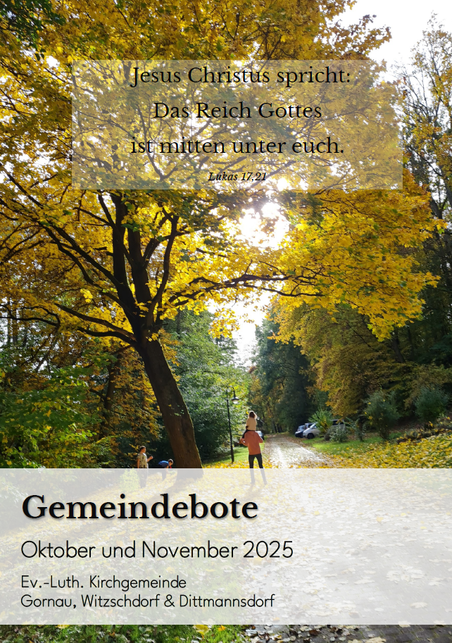 Hier findet ihr den aktuellen Gemeindeboten unserer Kirchgemeinden Gornau, Dittmannsdorf und Witzschdorf Oktober/November 2025 zum Download: Gemeindebote Oktober/November 2025